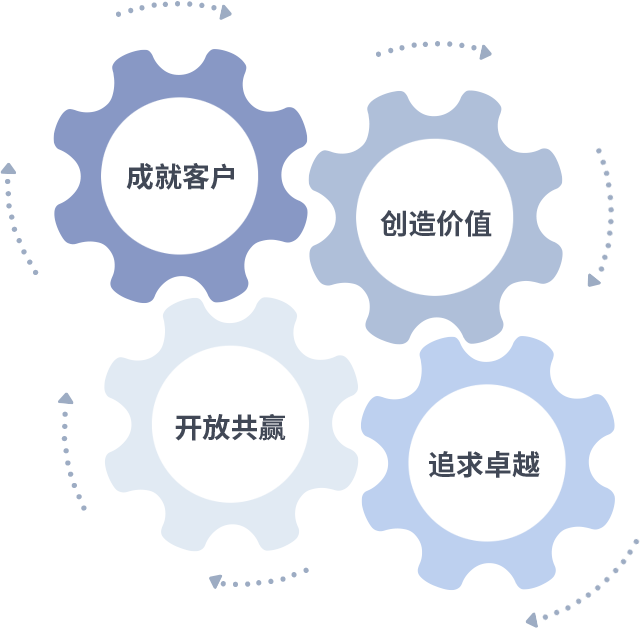 成就客户是一切决策的出发点,创造价值是衡量所有工作的标准,追求卓越是利盈做事做人的态度,开放共赢是利盈的格局也是最终的结果。价值观的齿轮环环相扣,推动着组织里的每个人不断向前。